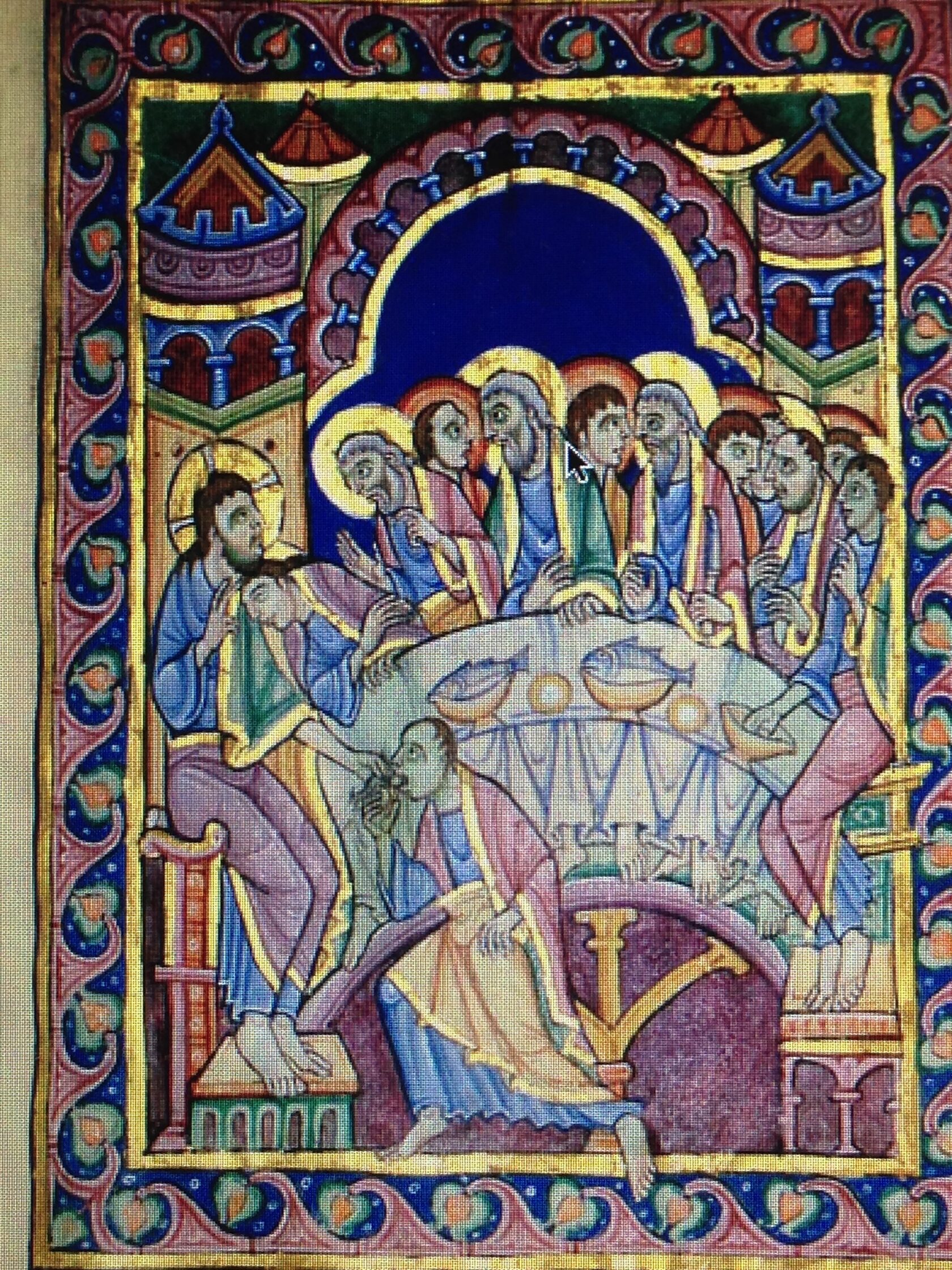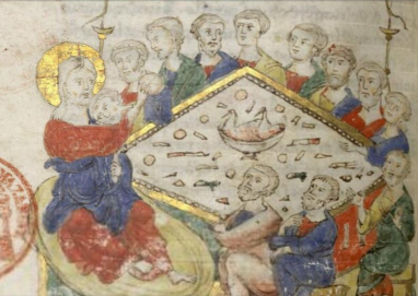 1.2. Круглый / овальный стол Круглый / овальный стол является средневековой вариацией стола-сигма. Первые изображения такой формы стола начинают появляться уже к XI в. (Перикопа Генриха II, XI в., fol. 214v; Перикопа св. Эрентруды Зальцбургской, ок. 1140 г, fol. 31r.; Никола Верденский, Клостернойбургский алтарь, 1181 г.) и просуществуют вплоть до 1-й пол. XIV в. (Пьетро Лоренцетти, Нижняя церковь б. Сан-Франческо, ок. 1320-г г., росписи трансепта, Ассизи), развиваясь параллельно с изображениями прямоугольного стола.
